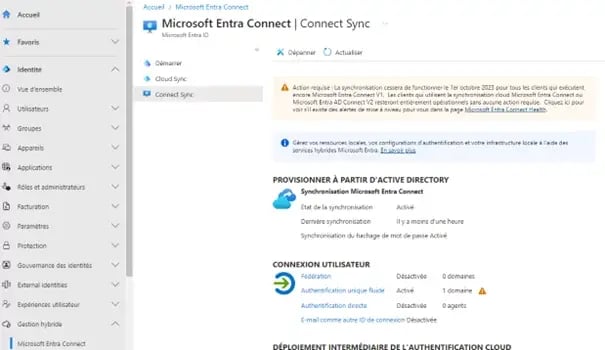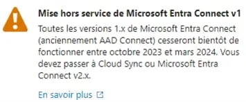 Ce message signifie clairement que si vous utilisez Entra Connect (anciennement Azure AD Connect) en version 1, les synchronisations de vos utilisateurs, groupes, mots de passe, etc., cesseront de fonctionner.