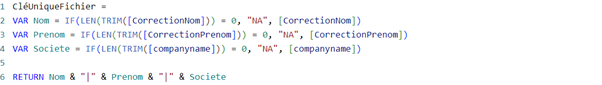 Ensuite, en utilisant DAX, nous avons introduit une nouvelle colonne dans chacune de nos tables nécessaires. Cette colonne agit comme un identifiant unique pour repérer nos cibles avec précision. Nous avons uniformément créé cette clé dans chaque table en combinant les données disponibles qui avaient été préalablement nettoyées, assurant ainsi une structure cohérente. La clé unique est systématiquement formée à partir des trois éléments : variable 1, variable 2, et variable 3, garantissant une cohérence à travers toutes nos tables et facilitant les comparaisons inter-tables.