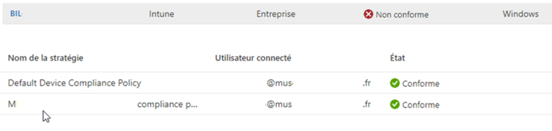 Il nous a alors suffi de vérifier, deux jours plus tard, les logs de connexion des utilisateurs dont les machines semblaient être remontées comme non conformes pour observer que, si l’accès avait été activé, celles-ci n’auraient pas été bloquées par celui-ci. Cela confirme donc que la machine est bien conforme et qu’il s’agit d’un problème d’affichage au sein d’Intune.