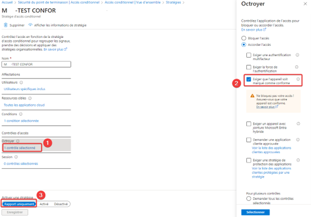 C’est sur la deuxième désignation que l’utilité de cet accès conditionnel a été trouvée. Il s’agissait alors de créer un accès conditionnel restrictif bloquant la connexion de tout appareil désigné comme non conforme, de l’associer à tous les utilisateurs et, bien évidemment, de le laisser en rapport uniquement pour qu’il n’y ait aucun impact sur la productivité.