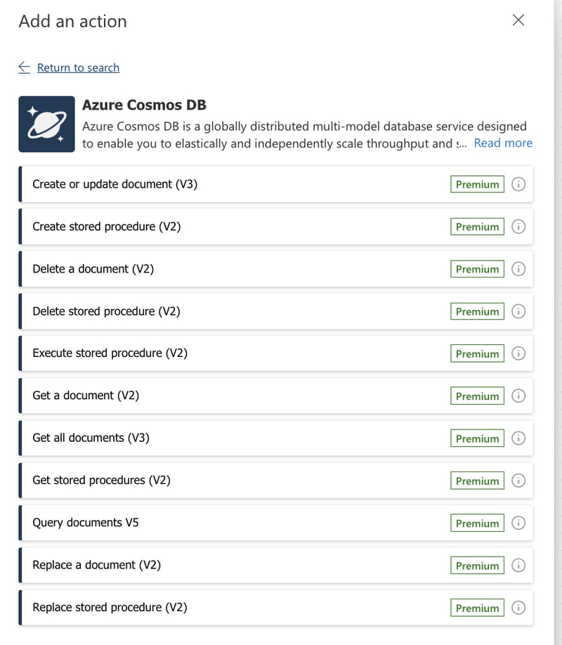 - Rechercher l’action Cosmos DB : dans la barre de recherche, tapez « Cosmos DB« .