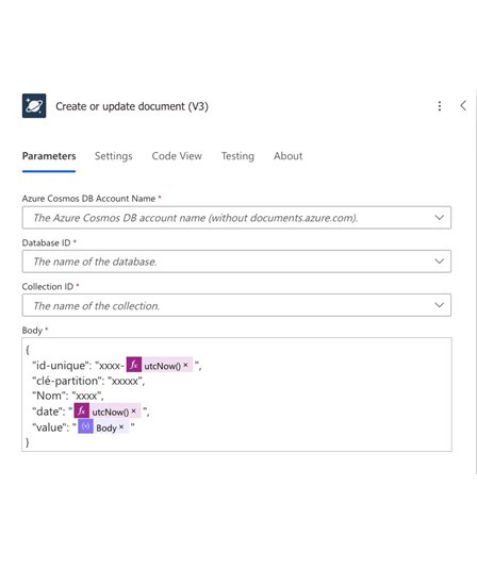 - Body : c’est ici que vous allez créer l’objet JSON à insérer dans Cosmos DB. Vous devez structurer ce JSON en fonction des champs que vous souhaitez stocker. Voici un exemple :