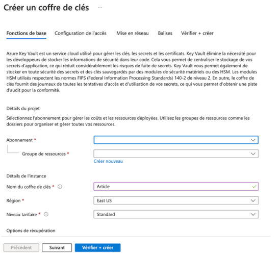 - Créer un Key Vault :