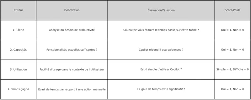 Un tableau d’évaluation ci-dessous permet de juger de la pertinence de Copilot en fonction des besoins :
